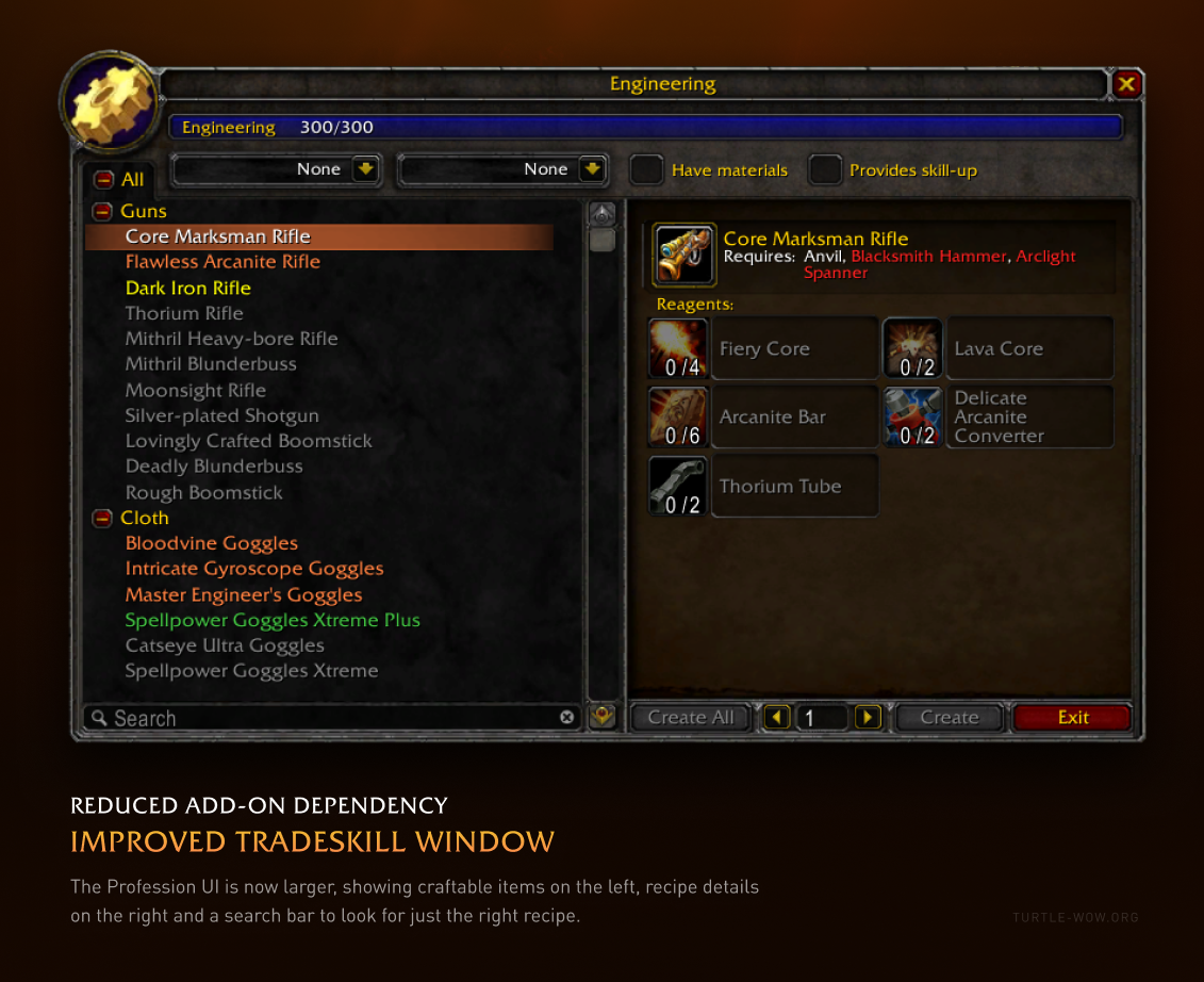 The profession UI is now larger, having additional options such as **Have materials** and **Provides skill-up**. There is also a search bar along the bottom of the recipe list to save you from the endless scrolling!