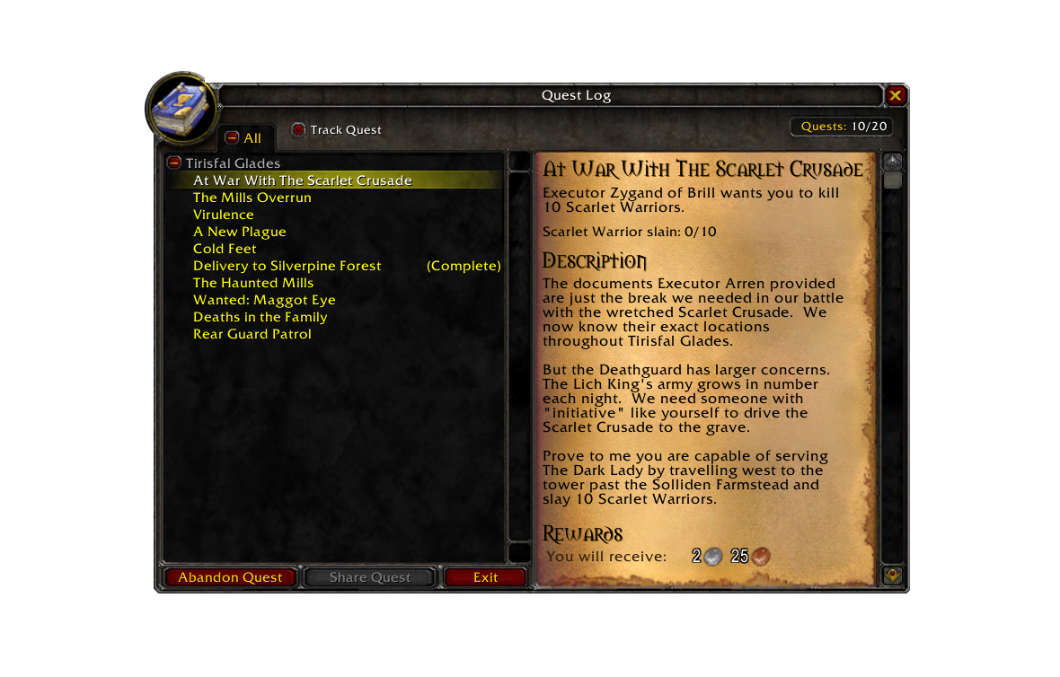 The quest log is now larger, giving players enough space to see all their quests at the same time. This does not allow us to bypass the 20 quest limit, which we plan to change in OctoWow 2.0